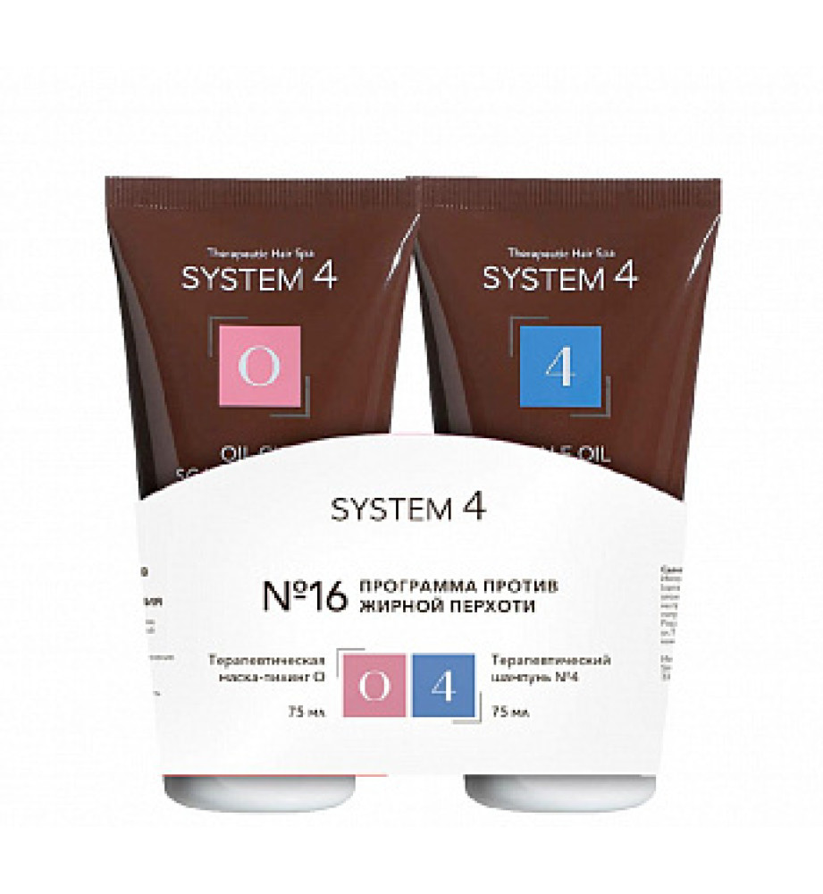 Программа для лечения жирной перхоти включает терапевтическую маску О для глубокого очищения кожи головы и терапевтический шампунь №4.