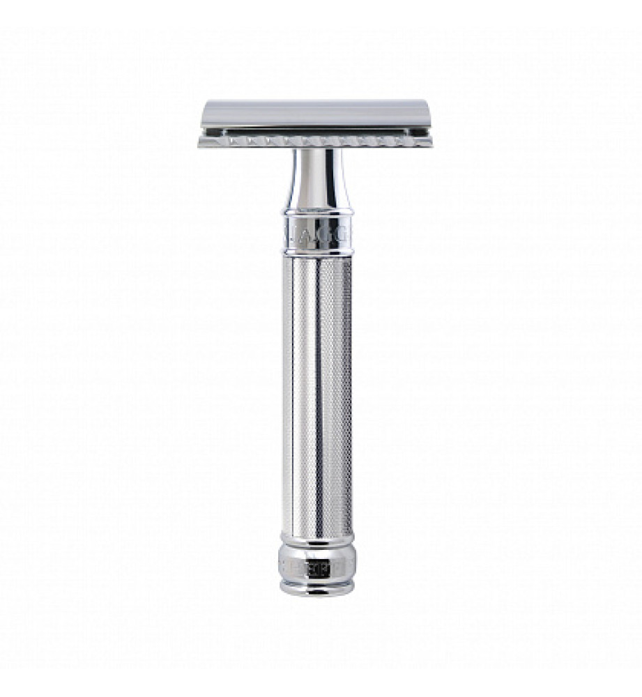 Хромированная традиционная бритва. Перфорированная ручка бритвы улучшает сцепление бритвы с рукой во время бритья. Состоит из трех частей и имеет безопасный закрытый гребень.